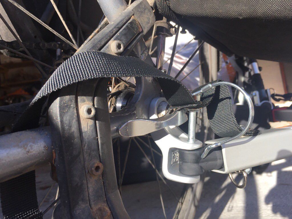Yet another company fails design 101 test actual use of product: Burley hitch connector can't clear wheel skewer...