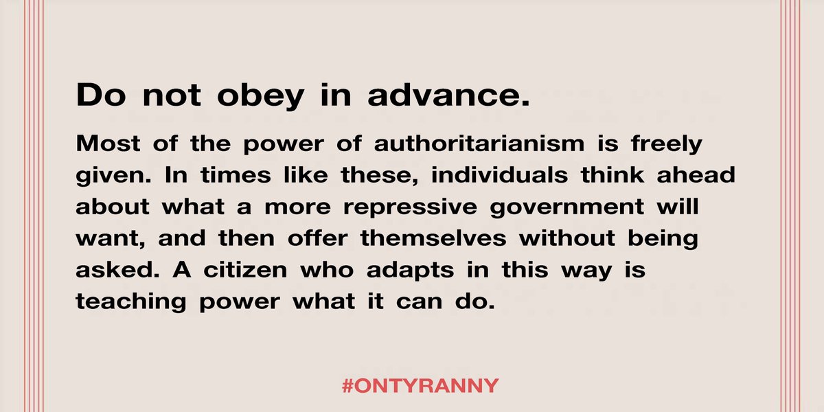 RT @TimothyDSnyder: 1/20. Do not obey in advance. #OnTyranny