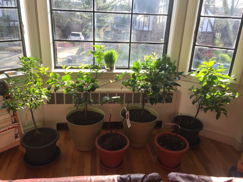 All four dwarf citrus about to bloom = peak indoor orchard bouquet: lemon, orange, mandarin, and lime…!