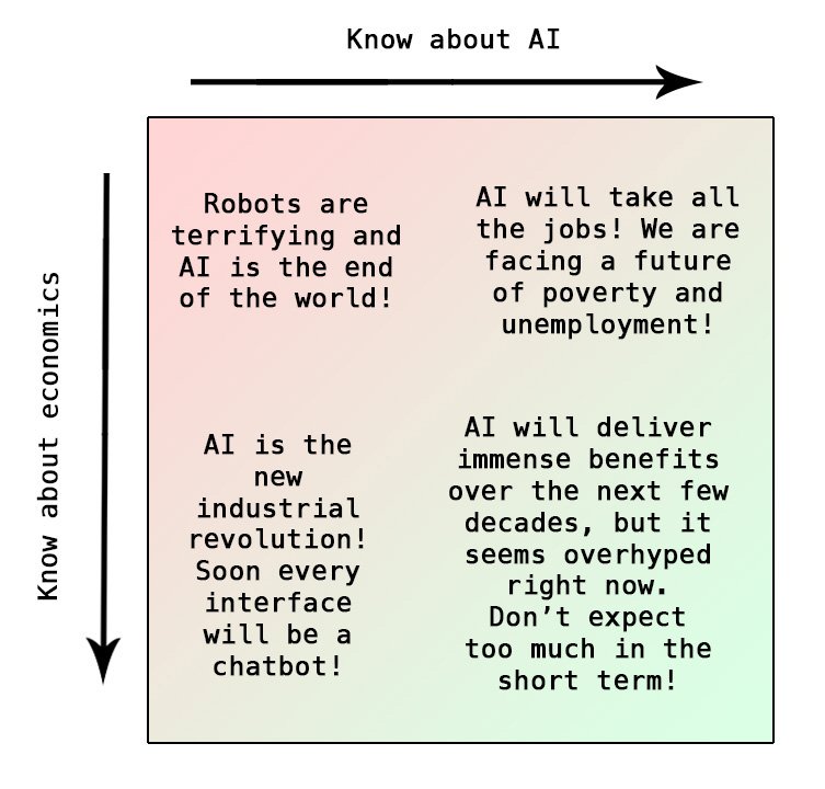 RT @fchollet: Pundit opinions on AI, depending on understanding of technology and economics: