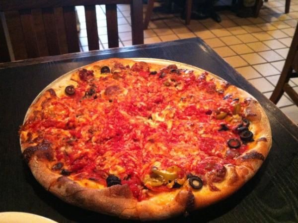 Sausage, pepperoni, olives, and hit peppers at Santarpios. Mmmmmm