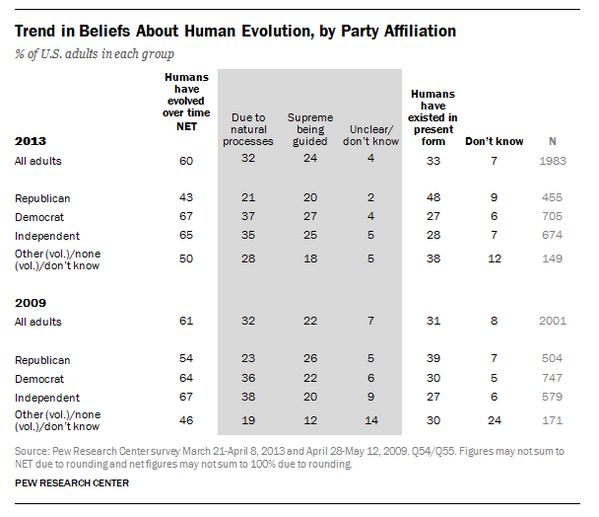 : Republican belief in human evolution dropped from 54% to 43% in 4 yrs.